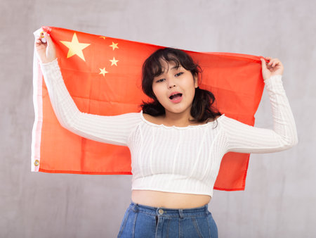 Young woman stand holding China flag and looking at the camera with white background. Space for Text