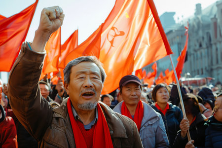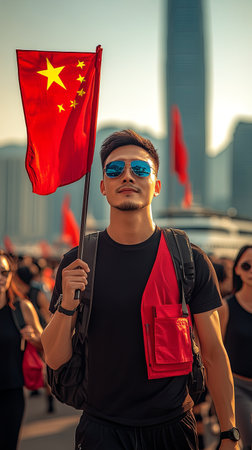 Large crowd waves Chinese flags in Tiananmen Square during sunset creating a patriotic atmosphere Perfect for illustrating Chinese culture and.