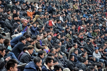 LEISHAN, GUIZHOU PROVINCE, CHINA – CIRCA DECEMBER 2017: The spectators watching the Water buffalos fighting.