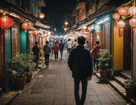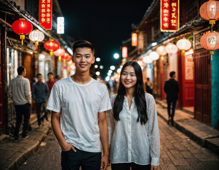 photo of happy beautiful young teenage lover couple asian at chinatown street at night, generative AI