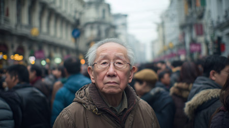 A thoughtful elderly man stands out in a bustling urban environment, surrounded by a blur of people and city architecture
