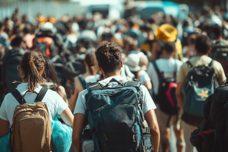 Refugees navigate a crowded border area, carrying backpacks and suitcases, as they seek safety and a better future amidst uncertainty.