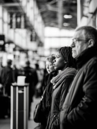 A group of travelers stands still at a busy airport terminal, capturing moments of anticipation amidst a bustling travel scene in black and white.
