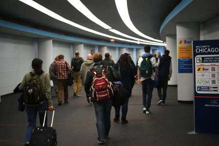 Chicago, United States - December 21, 2015: Travellers walk along a tunnel to the arrival terminal and customs station at O'Hare International Airport Chicago on December 21, 2015, Chicago.