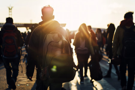 A man with a backpack standing in front of many people, AI