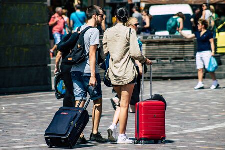 Prague, Czech Republic - August 17, 2019: Groups of tourists walking in the streets of Old City