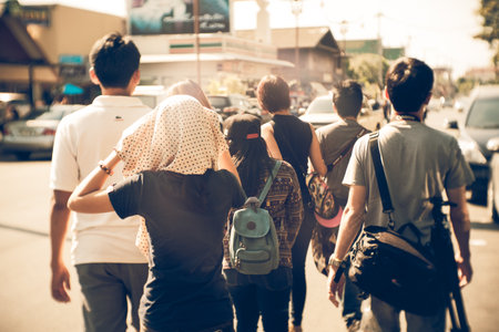 People group of friends with backpacks making tourism background.vintage or retro tone.