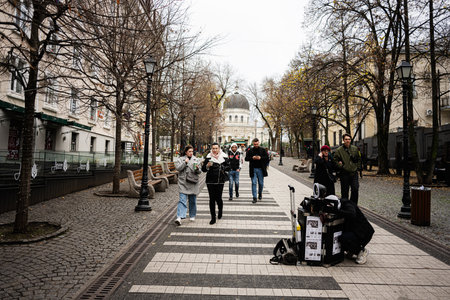 Chisinau, Moldova - November 22, 2025: Bustling city street in Chisinau Moldova with pedestrians, a street musician, and autumn atmosphere on a crosswalk.