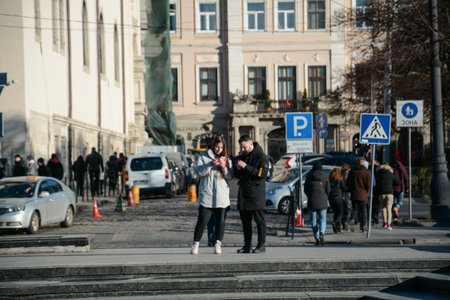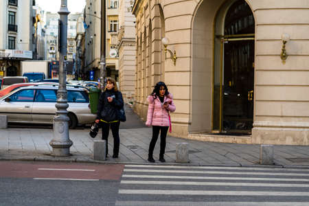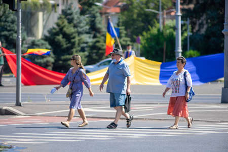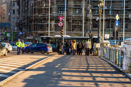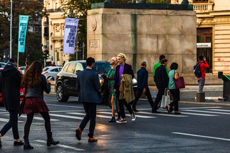 People, tourist crossing the street in downtown Bucharest, Romania, 2019