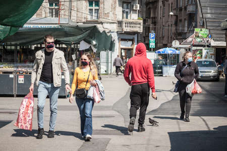 BELGRADE, SERBIA - APRIL 23, 2020: Young people, a couple, walking and buying groceries in a Belgrade green farmers market.