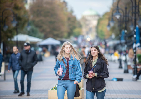 Sofia, Bulgaria - Nov 2 2020: Two teenage girls drinking shakes and not wearing protective masks despite the growing number of corona virus cases