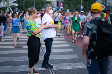Bucharest, Romania - August 07, 2021: People walking on the street. Real people.