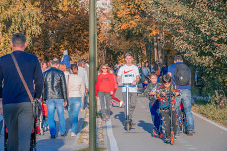 Kazan, Russia - October 03, 2020: Children and teenagers on scooters ride along the bike path in the city park on a sunny autumn day.