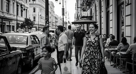 A black and white, candid street photograph of a busy European city sidewalk. A woman in a floral dress walks forward, smiling brightly, while a young boy in a striped shirt runs ahead. People are walking, talking, and sitting at an outdoor cafe, with taxis and classic architecture in the background.