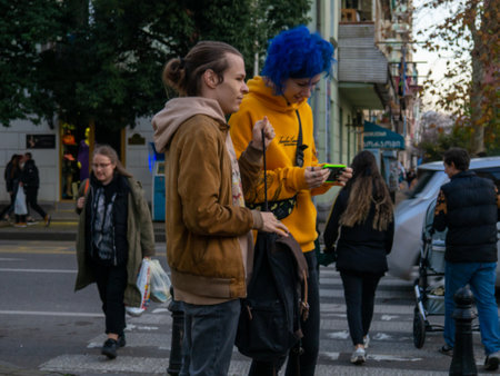 Batumi, Georgia. 12.18.2022 People on the streets. Girl with blue hair on the street. phone in hand