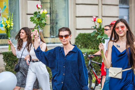 People holding flowers during peaceful protests against stolen presidential elections in Minsk, Belarus. Minsk, Belarus - August 15 2020.