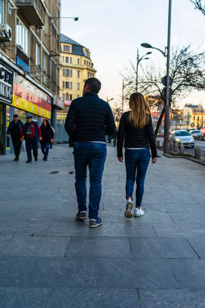 People moving, walking on the streets in downtown of Bucharest, Romania, 2021