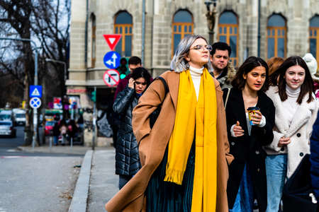People with winter coats walking on busy street in downtown of Bucharest, Romania, 2019.