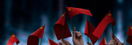 Group of people waving chineese flags. People raising chineese flags up to the sky.