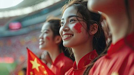 Focus on happy smiling young chinese woman with national attributes standing on tribune, watching football match and cheering up favorite team