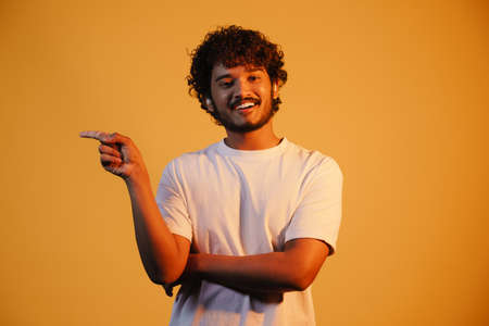 Young middle eastern man in earphones pointing fingers aside isolated over yellow wall