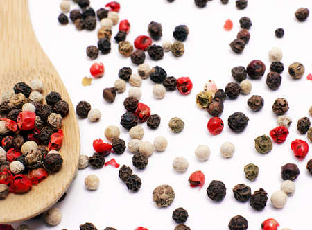 Spice of multicolored pepper on white background, high angle view.