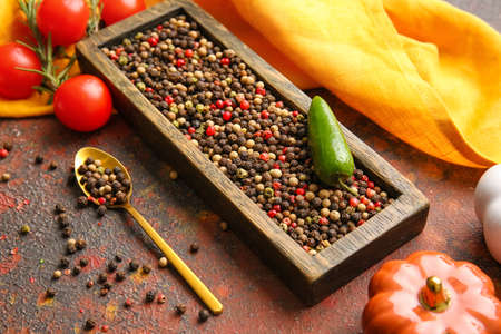Composition with mixed peppercorns on grunge background