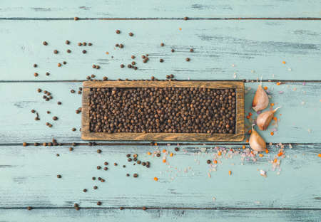 Black peppers are scattered over vintage wood background.