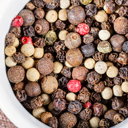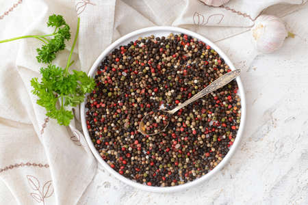 A mixture of different peppercorns white, black, red and green peppers spices.
