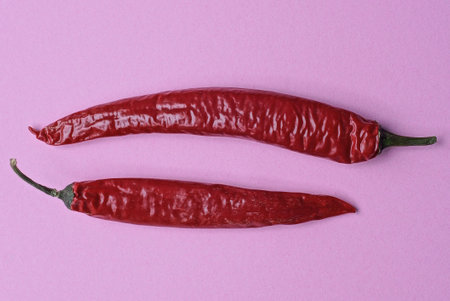 Dried chili peppers isolated on white background top and bottom arrangement. Flat layout.