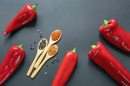 Pepper. Bright red sweet peppers on dark background. Spice in wooden spoons. Flat lay, free space for text