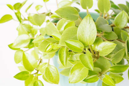 Green variegated plant Peperomia Pixie Lime close-up. home plant concept. Texture of flower leaves. tropical plants