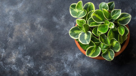 Overhead view of a decorative plant with bold green leaves in a clay pot, offering space for copy.