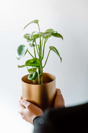 Hands holding peperomia polybotrya (peperomia raindrop) in golden flower pot. Green houseplant on white background. Concept of urban jungle, houseplant care