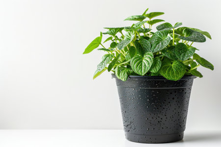 A close-up shot of a vibrant green plant in a black pot, showcasing the freshly watered leaves and the black pot with water droplets. The plant is isolated against a white background.