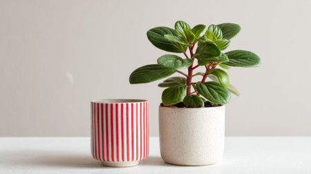 Bright green plant sits elegantly beside striped red and white pot on a simple table surface.