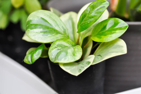 Close-up of Peperomia Obtusifolia Variegated, a small succulent plant with variegated leaves. Ornamental plants for decorating in the garden or room decor.