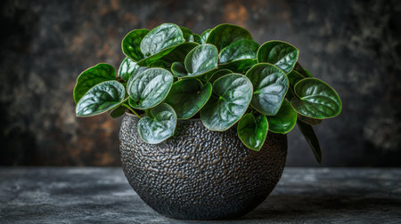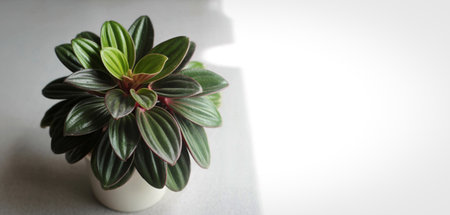 houseplant peperomia in grey pot on light brown background copy space