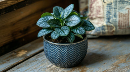 A beautiful close-up of a green plant in a decorative pot, illuminated by soft sunlight, creating a serene atmosphere on a rustic wooden table.