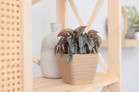 Beautiful houseplant and vase on wooden shelving unit in room