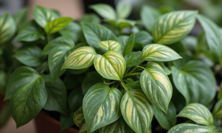 Pothos (Epipremnum aureum) Trailing vine with glossy, heart-shaped leaves in green and yellow or variegated patterns, grown in hanging baskets