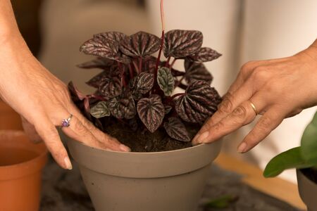 Home gardening woman relocating house plant