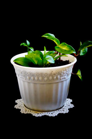 Green plant in a white pot on a black background