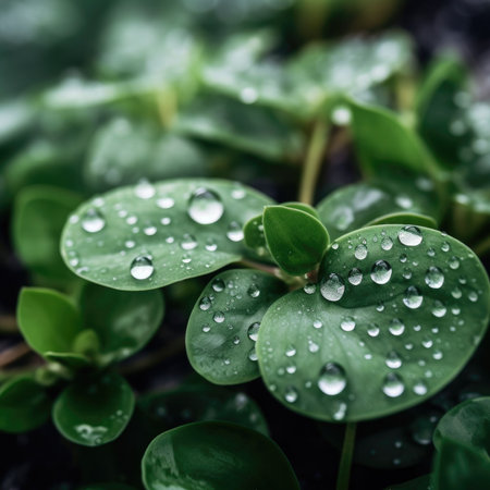 An AI generated illustration of a close-up of a vibrant green plant with dew droplets on its leaves