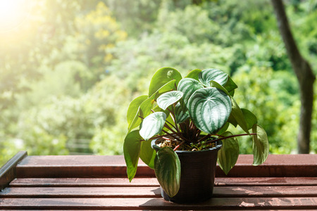 Peperromia emerald ripple on wooden background