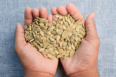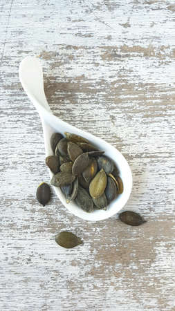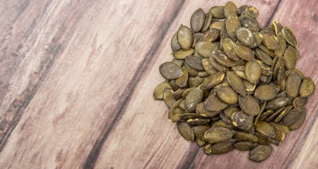 Raw pumpkin seeds as a organic and superfood concept on rustic background with copy space