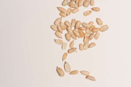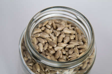 Sunflower seeds scattered on the white vintage table from a jar. Healthy vegetarian protein nutritious food. Sunflower seed on rustic old wood.
