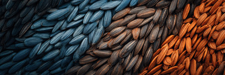 A close-up view highlights a vibrant collection of seeds arranged in stripes, showing various colors and textures. The scene captures natural beauty.