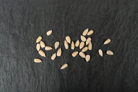 Peeled Sunflower Seeds, Raw Sunflower Kernels Flat Lay Group, Sun Flower Grains, Peeled Sunflower Seeds on Black Background Top View