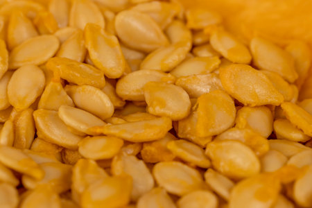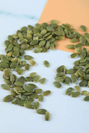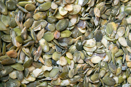 Macro background texture of green pumpkin seeds. Top views, close-up